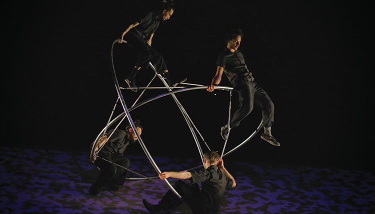 Perchés sur une originale sphère en métal, les acrobates de la compagnie Solfasirc nous offrent un spectacle sans limites, remettant en question la notion d’impossible.